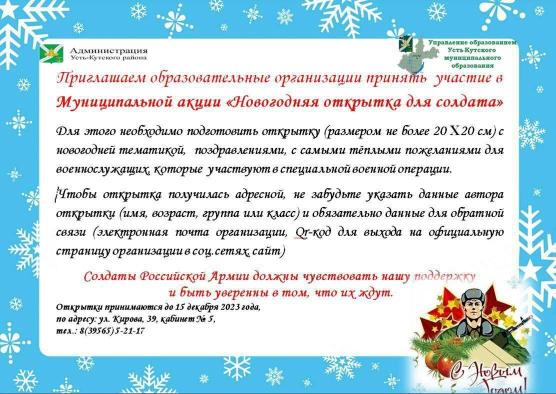 Образовательные организации Усть-Кута могут принять участие в муниципальной акции «Новогодняя открытка для солдата»