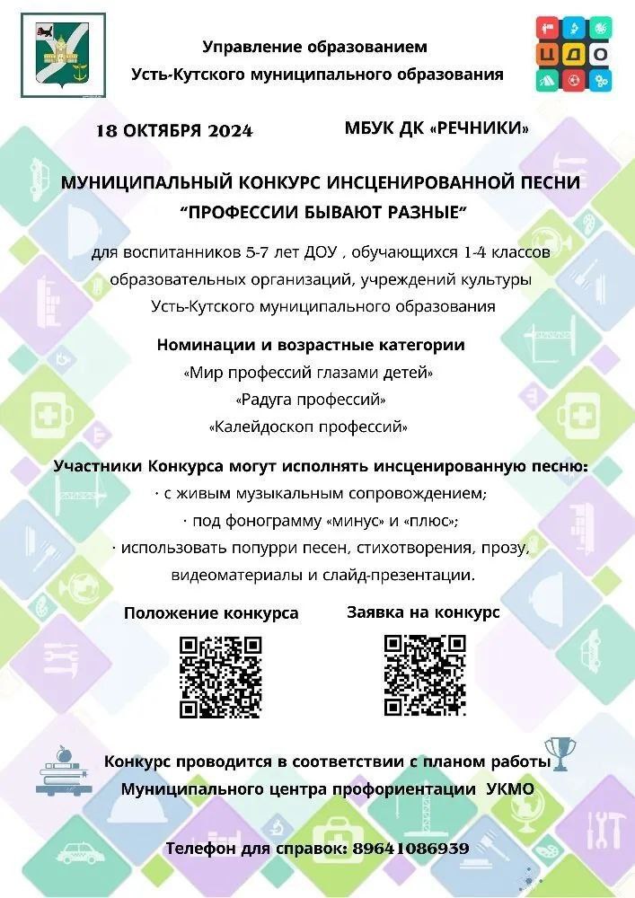 Конкурс «Профессии бывают разные» состоится 18 октября в ДК «Речники». Организатором выступил Центр дополнительного образования УКМО. Участие могут принять воспитанники 5-7 лет ДОУ, обучающиеся 1-4 классов образовательных организаций, учреждений культуры Усть-Кутского района.
